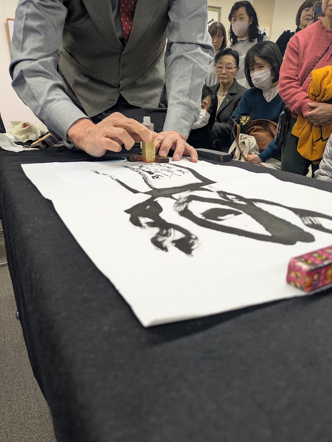 その後、佐藤氏による作品の実演があり、最終の落款の押印の位置についても解説があった。押印により作品がまた一段と魅力的になったことを目のあたりにした。