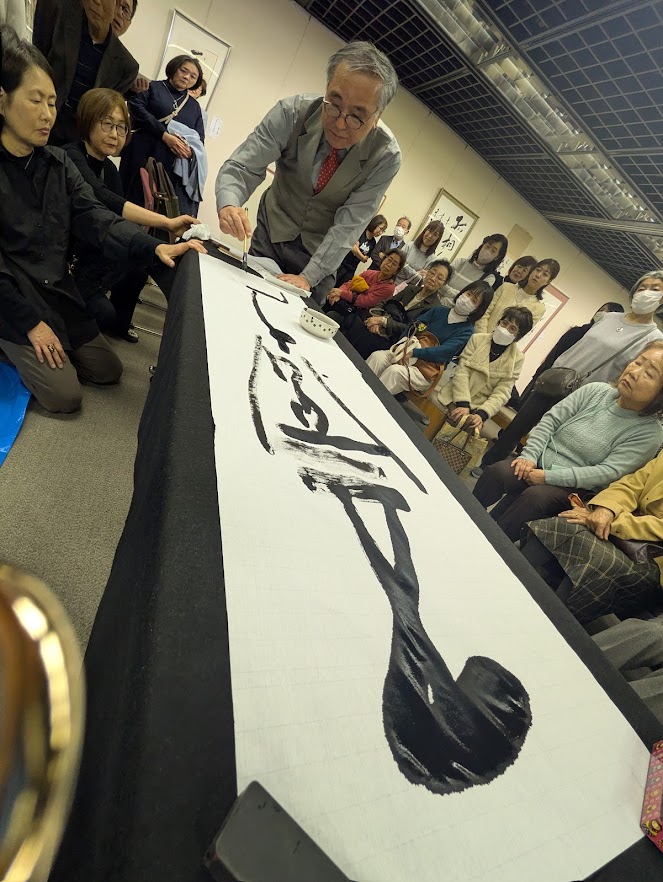 石飛氏は筆二本を使った揮毫と淡墨での条幅作品の揮毫の実演がなされ、筆つかいの見事さに会場参加者の視線が集中していた。