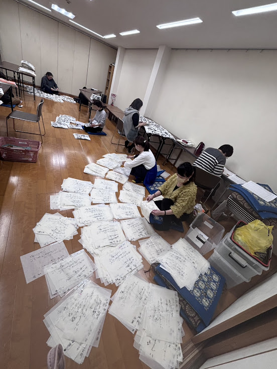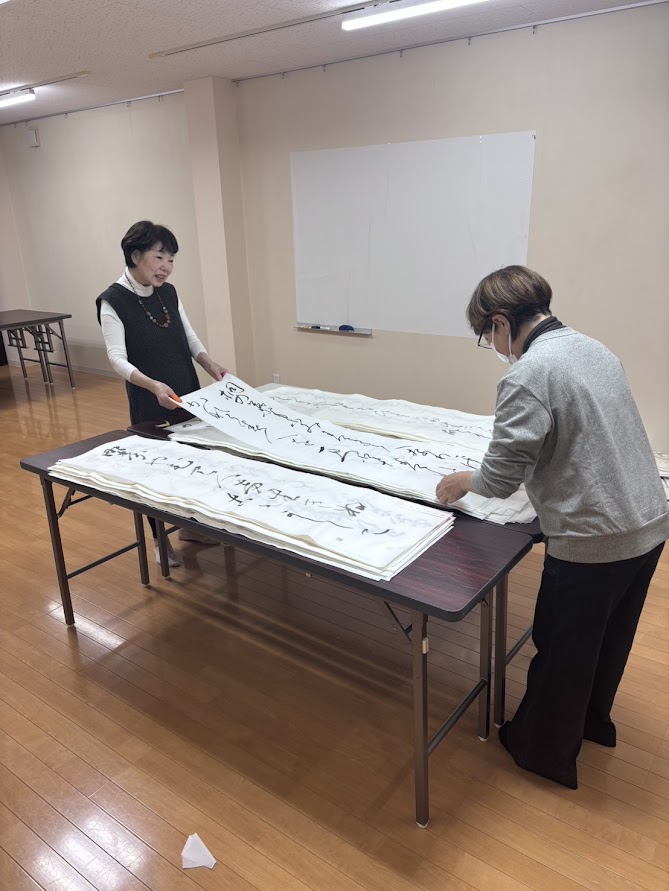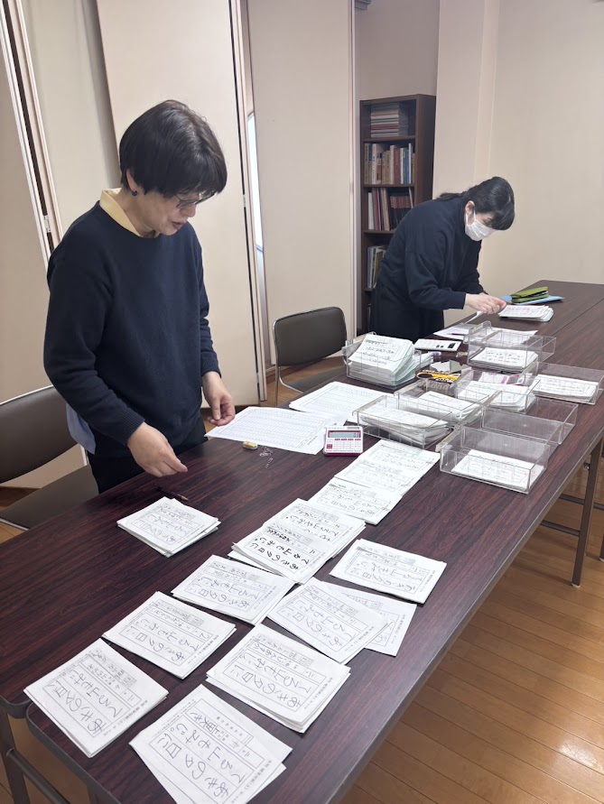 水明の競書の審査は漢字、かな両師範合格者がA.B.C班にわかれ3ヶ月に一度審査に当たっています。公平でスムーズな審査ができるように、事前に作品整理がきちんとおこなわれています。