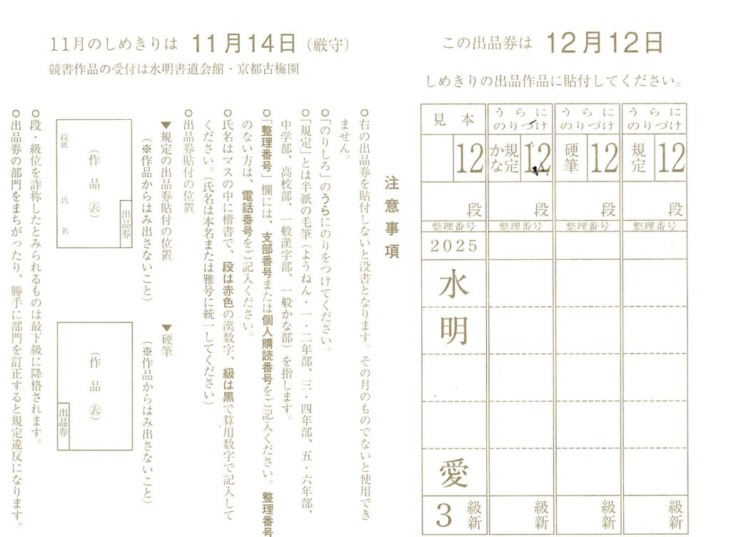 毎月の水明誌に付いている出品券と注意事項を載せておきます。再度ご確認ください。