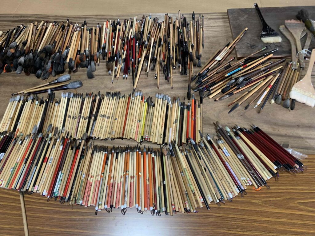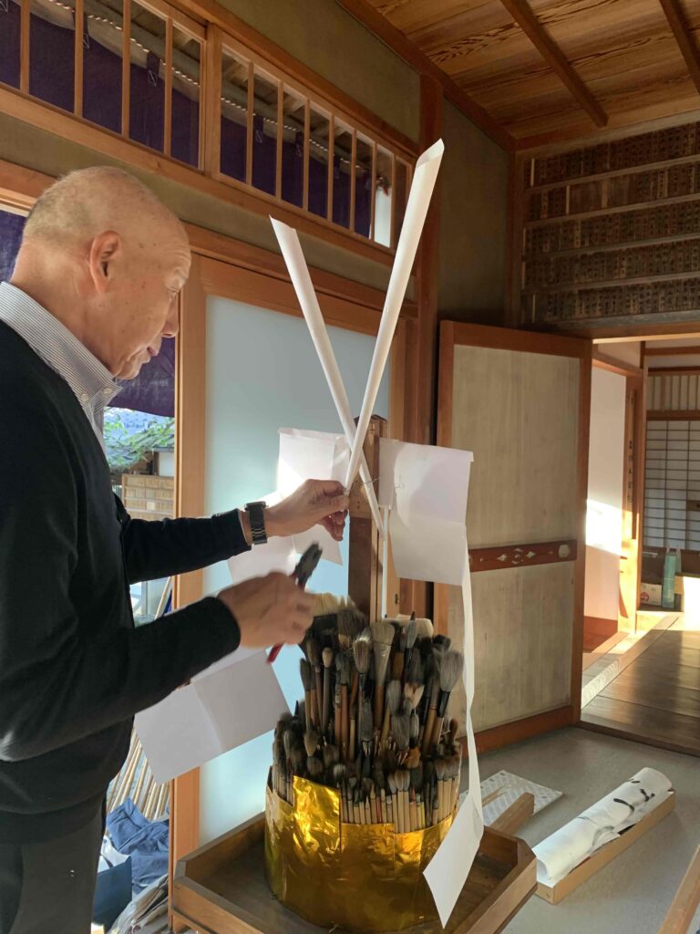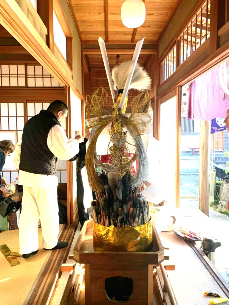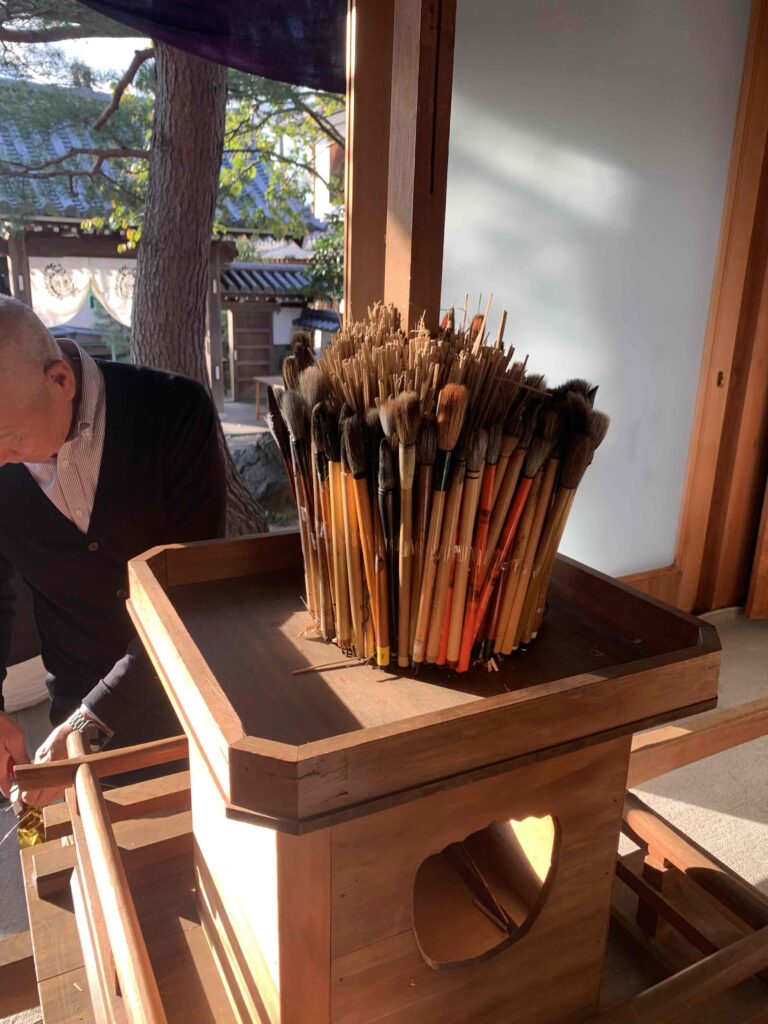 22日には皆さんがご持参下さった使い終わった筆を持参して筆神輿作りのご奉仕をさせていただきました。